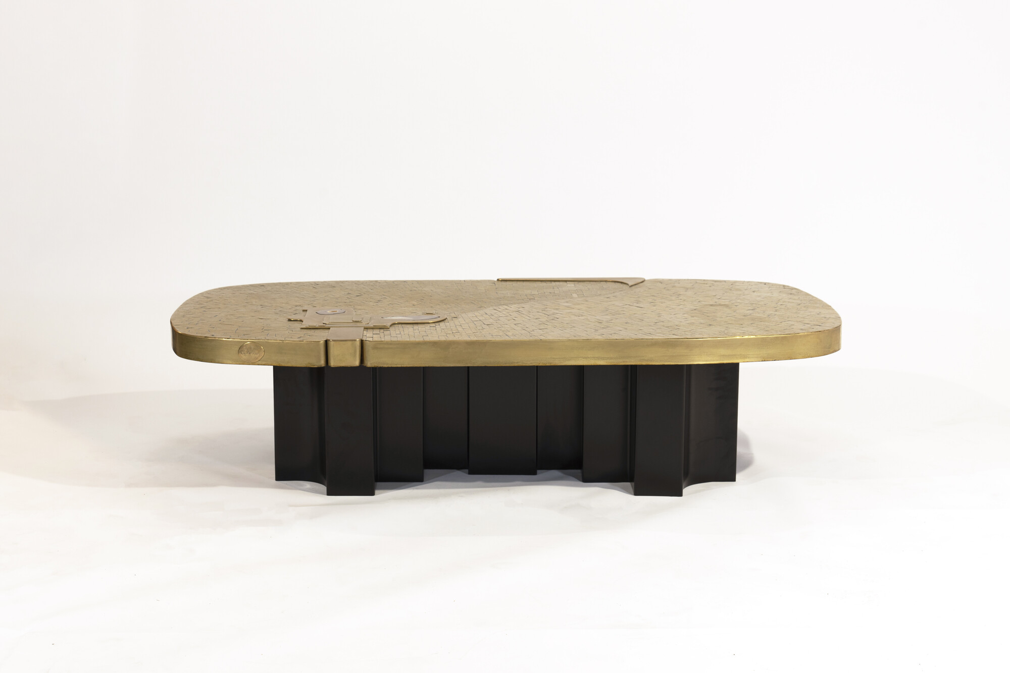 Coffee Table in mosaic brass and agates by Jean Claude Dresse.