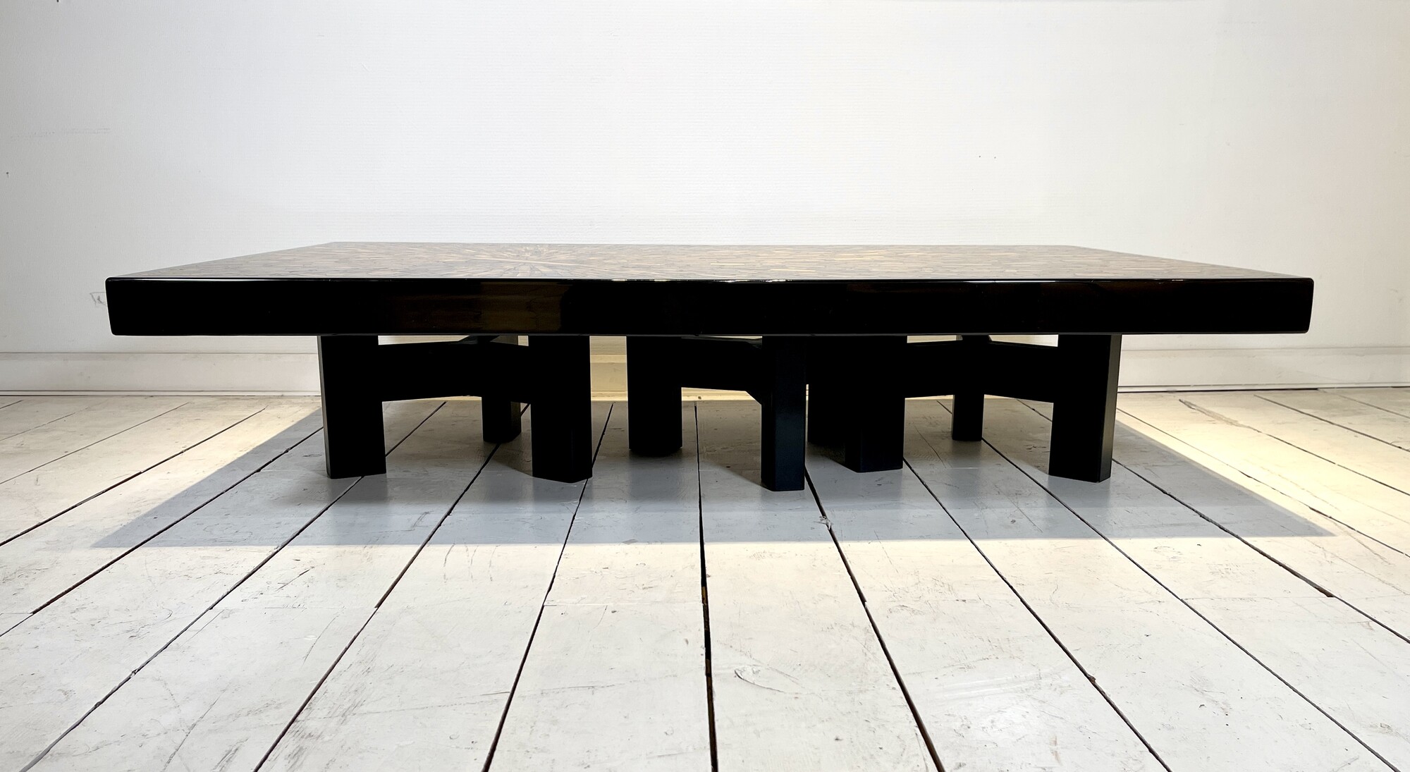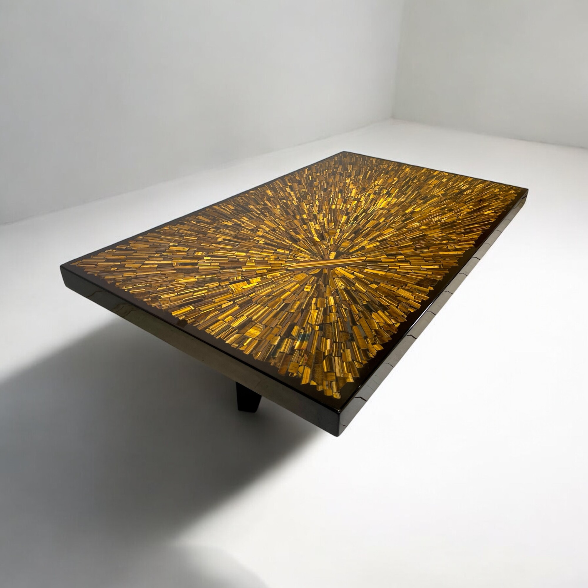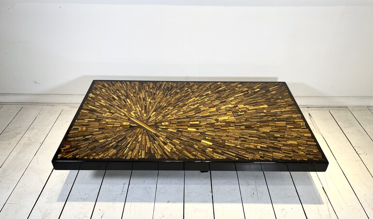 This unique coffee table by Dresse was owned by a Belgian private collection from Brussels. This example is custom-made and of a regular size (measuring 142cm) which is exceptionally large for Dresse's pieces. Besides its size, what is is important for the quality of this table is that the piece is made by hand with an tiger eyes inlay from scratch. All Dresse's pieces are handmade: ''The only tools used are shears to cut the mosaics and a polisher to finish the work. The thick, luxurious top is finished with a high-gloss black edge accompanied by an architectural 3-tripod base in black lacquered metal. The tiger's eye inlay has been placed off-center from the table, giving it a dynamic appearance and great visual depth. It is important to know that Dresse was the first to produce these kind of metal or stone mosaic tables in Belgium. Nowadays, these mosaic patterns are exemplary for design from Belgium in the 1970s and 1980s, which states the importance of the design of Dresse and this unique table.