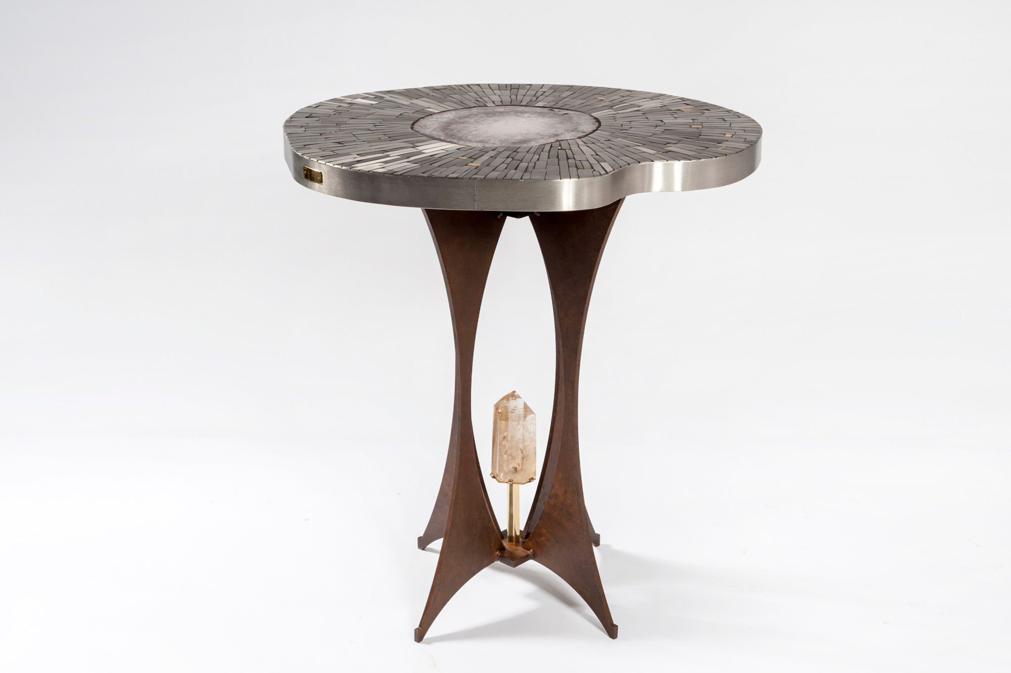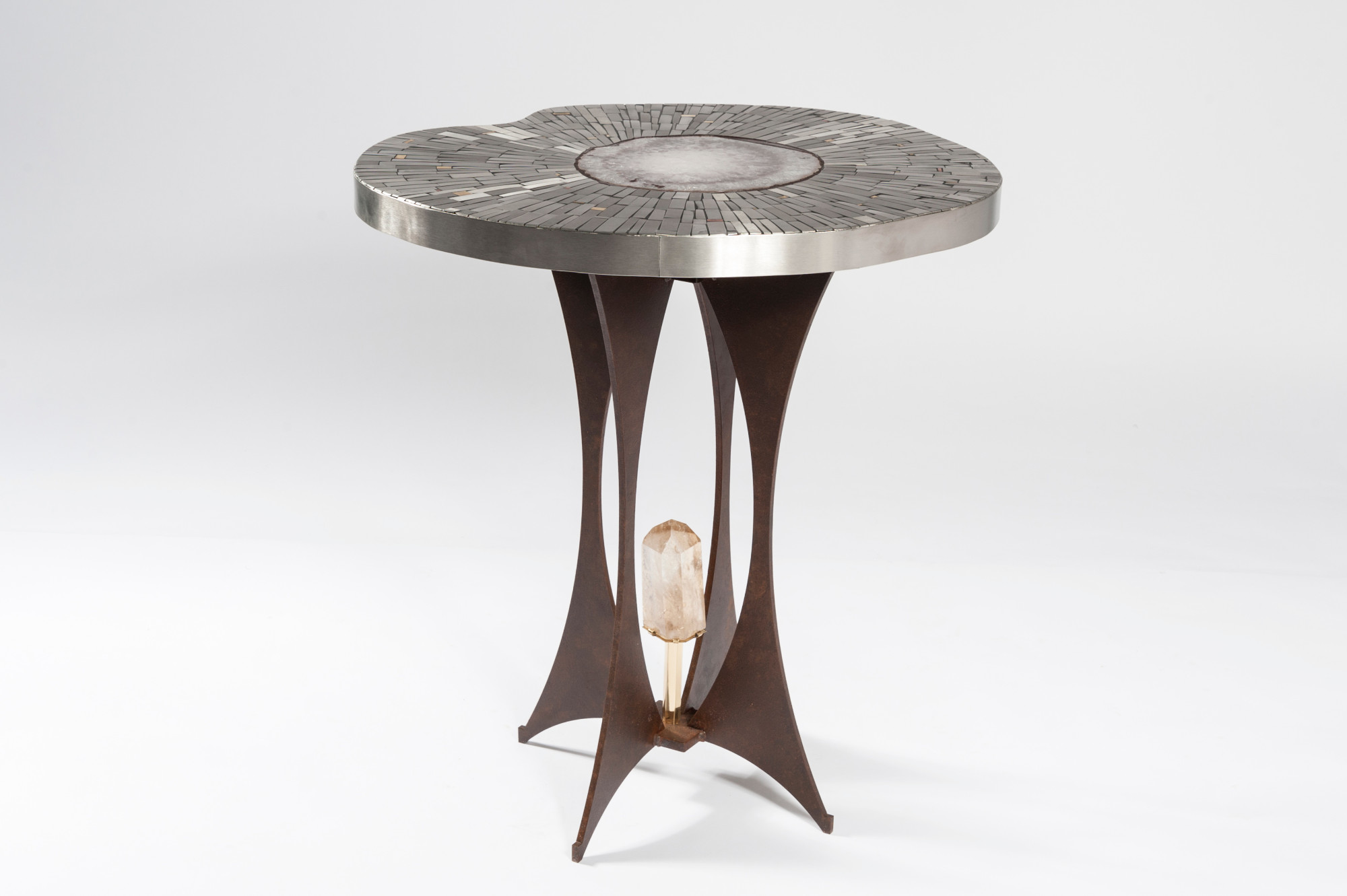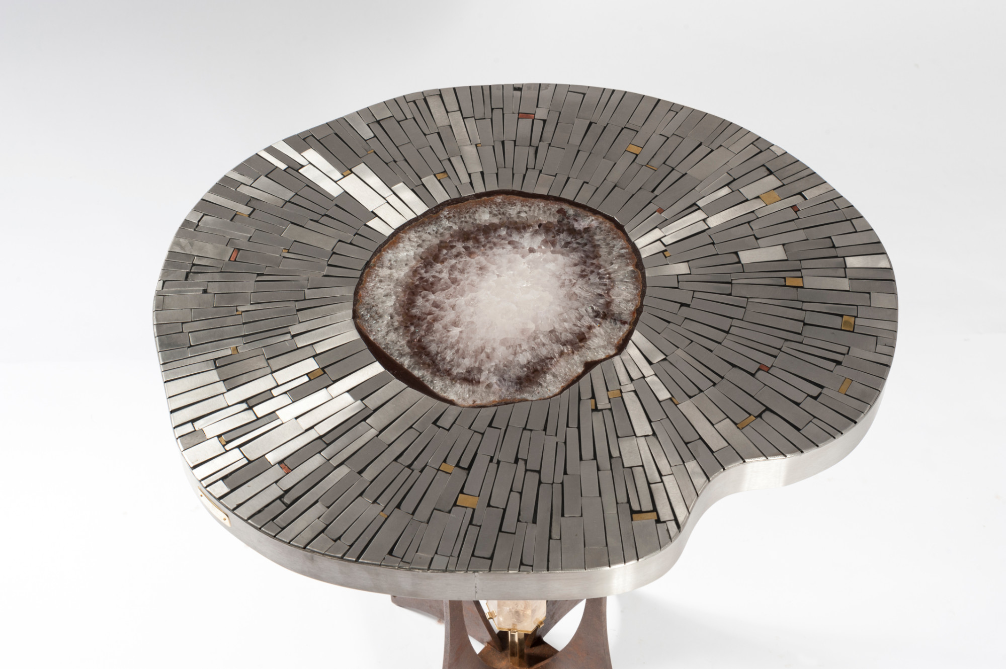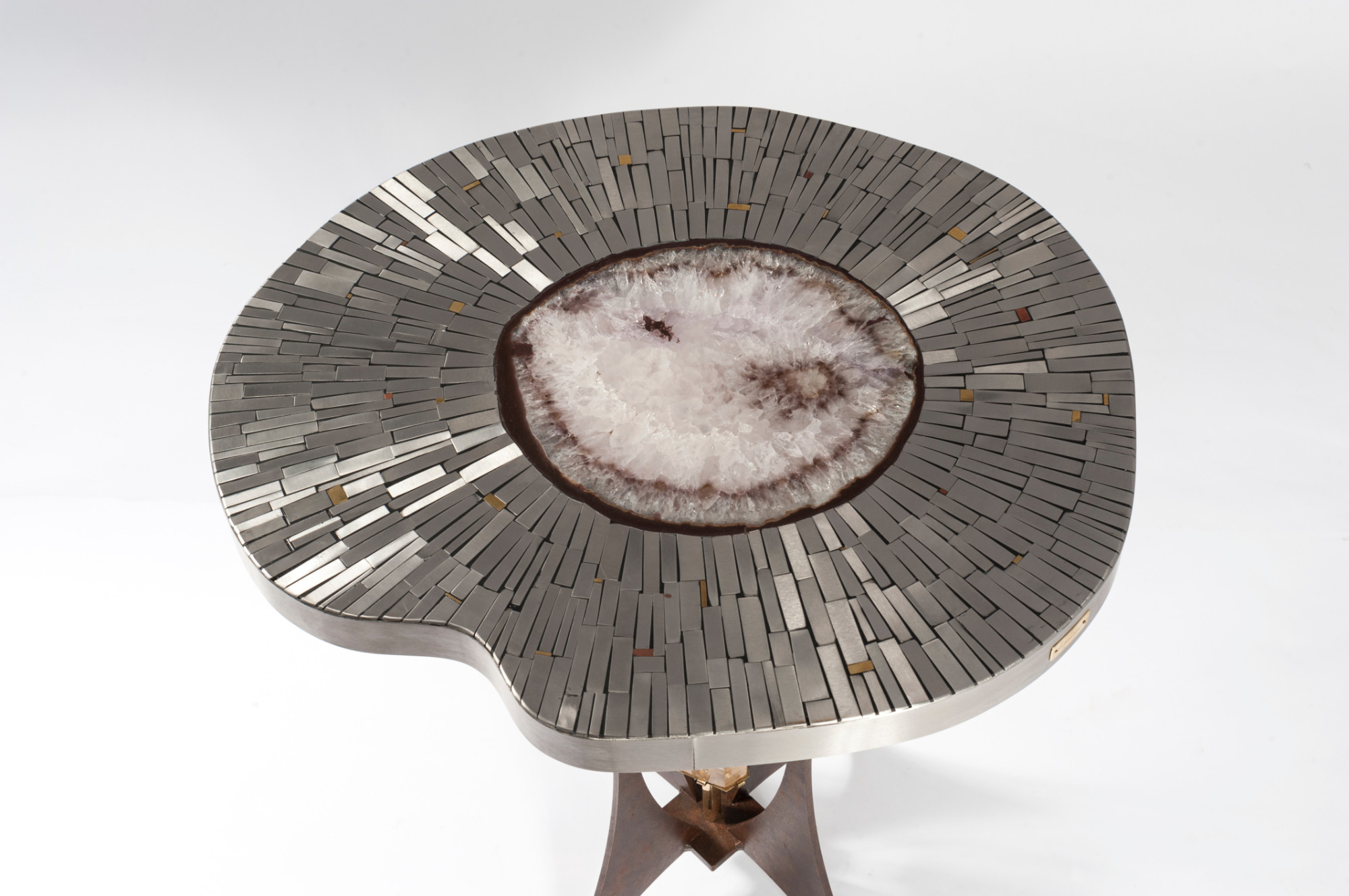 Created to measure by Stan Usel, this original pedestal table in stainless steel mosaic, inlaided with a unique agate stone and quartz stone, is  designed  to give your very home decoration a great sense of originality . Exceptional craftsmanship with the art of tailor made furniture. This original and unique pieces are signed by the artist and comes with the certificate of authenticity.All pieces can be custom-made to order. Proudly Belgian.