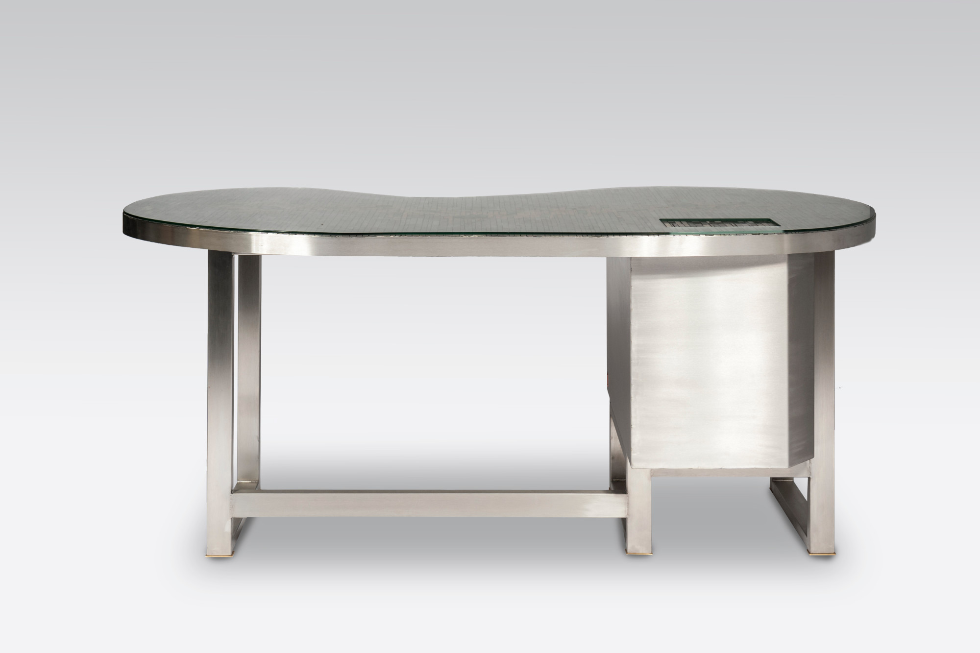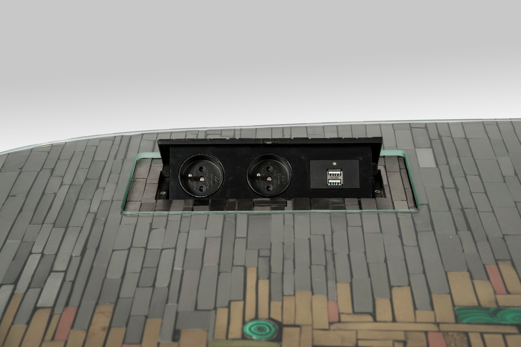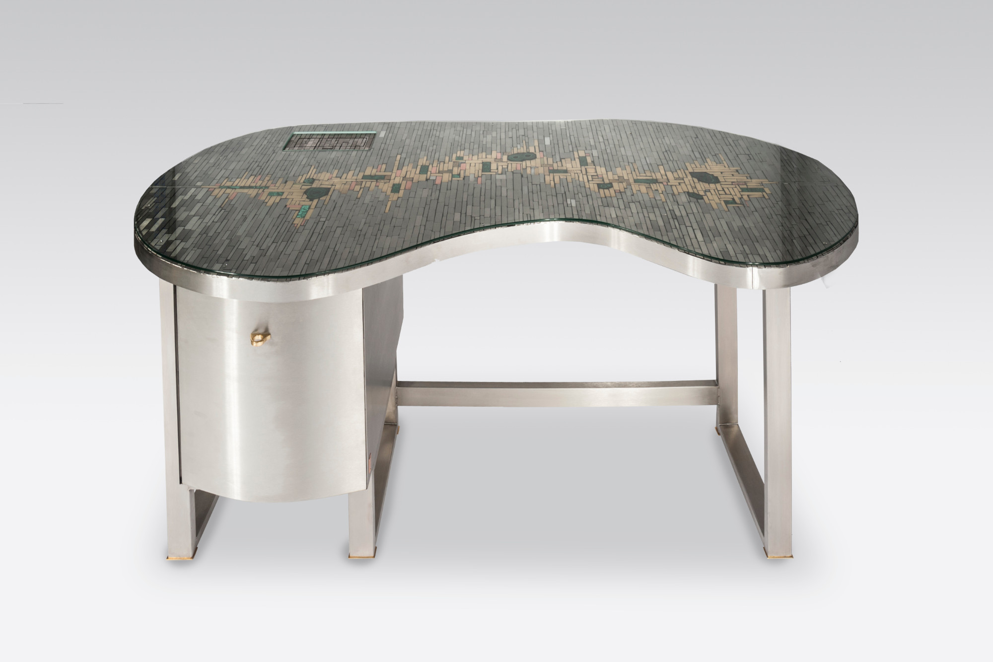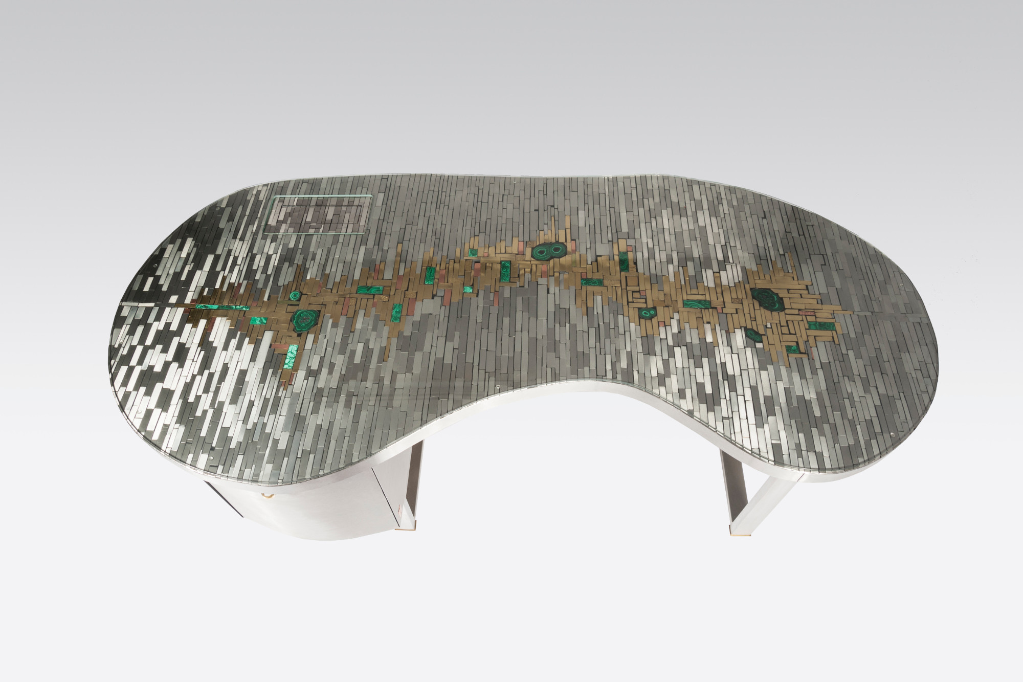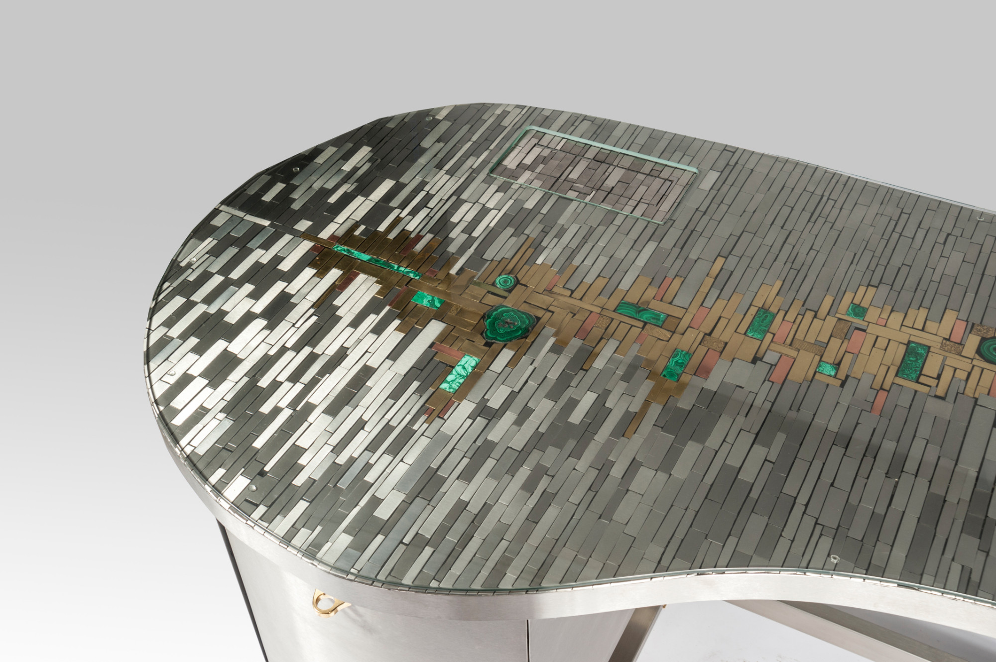Created to measure by Stan Usel, this desk of stainless steel, red copper and brass is inserted with a magnificent malachite and agates stones highlighting a mosaic radiation. Each piece is topped with unique stones and is discretly designed to offer the ultimate connectivity for your needs. Exceptional craftsmanship with the art of tailor made furniture. This original and unique piece is signed by the artist and comes with a certificat of authenticity.All pieces can be custom-made to order. Proudly Belgian.