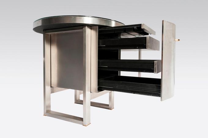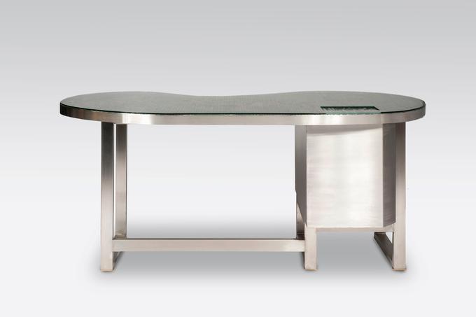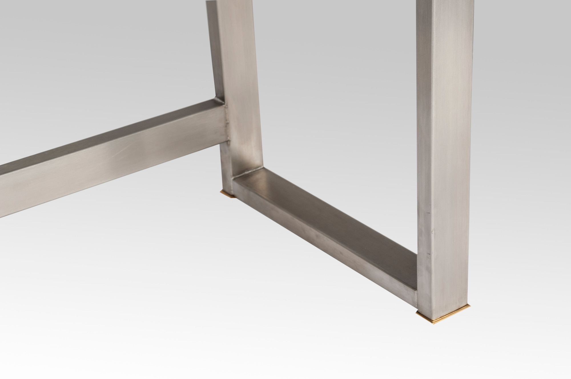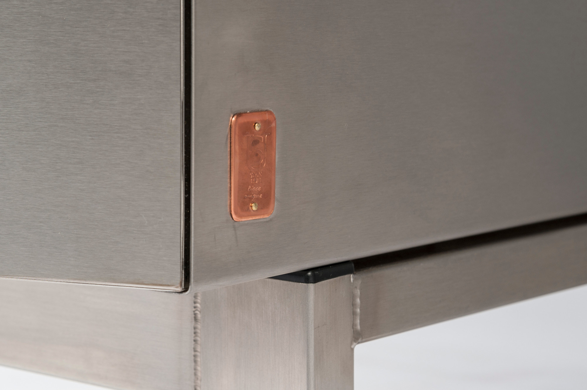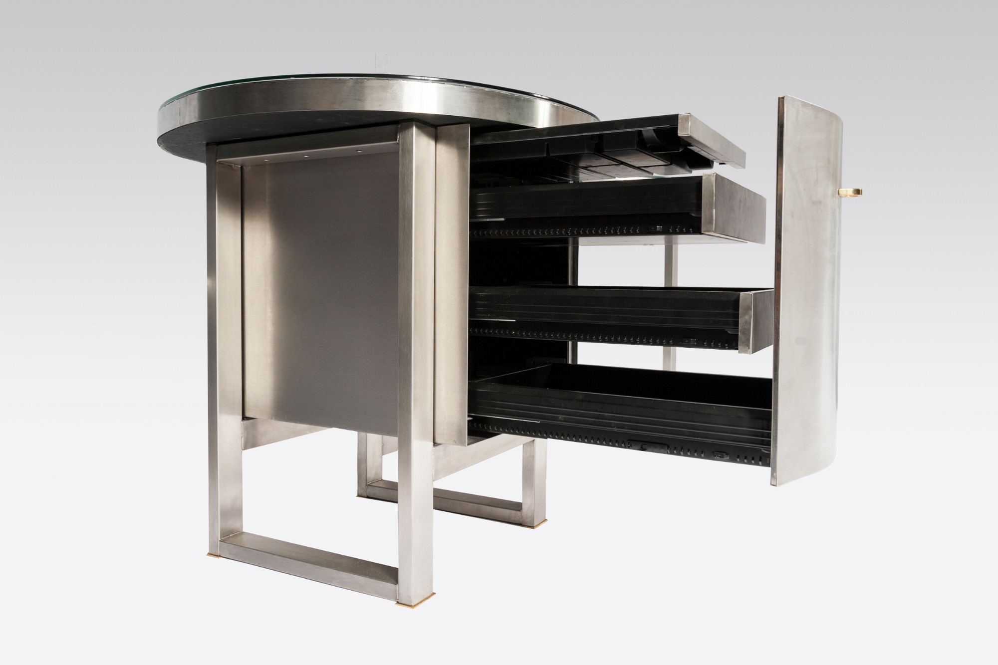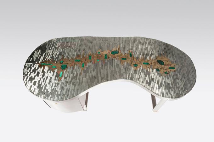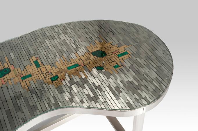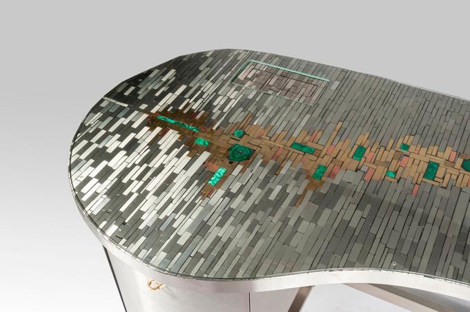 Created to measure by Stan Usel, this desk of stainless steel, red copper and brass is inserted with a magnificent malachite and agates stones highlighting a mosaic radiation. Each piece is topped with unique stones and is discretly designed to offer the ultimate connectivity for your needs. Exceptional craftsmanship with the art of tailor made furniture. This original and unique piece is signed by the artist and comes with a certificat of authenticity.All pieces can be custom-made to order. Proudly Belgian.