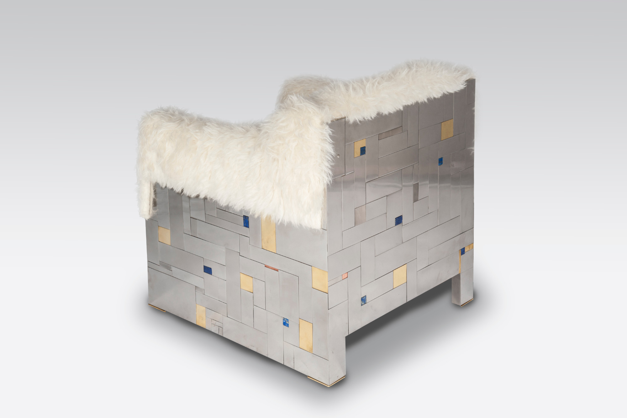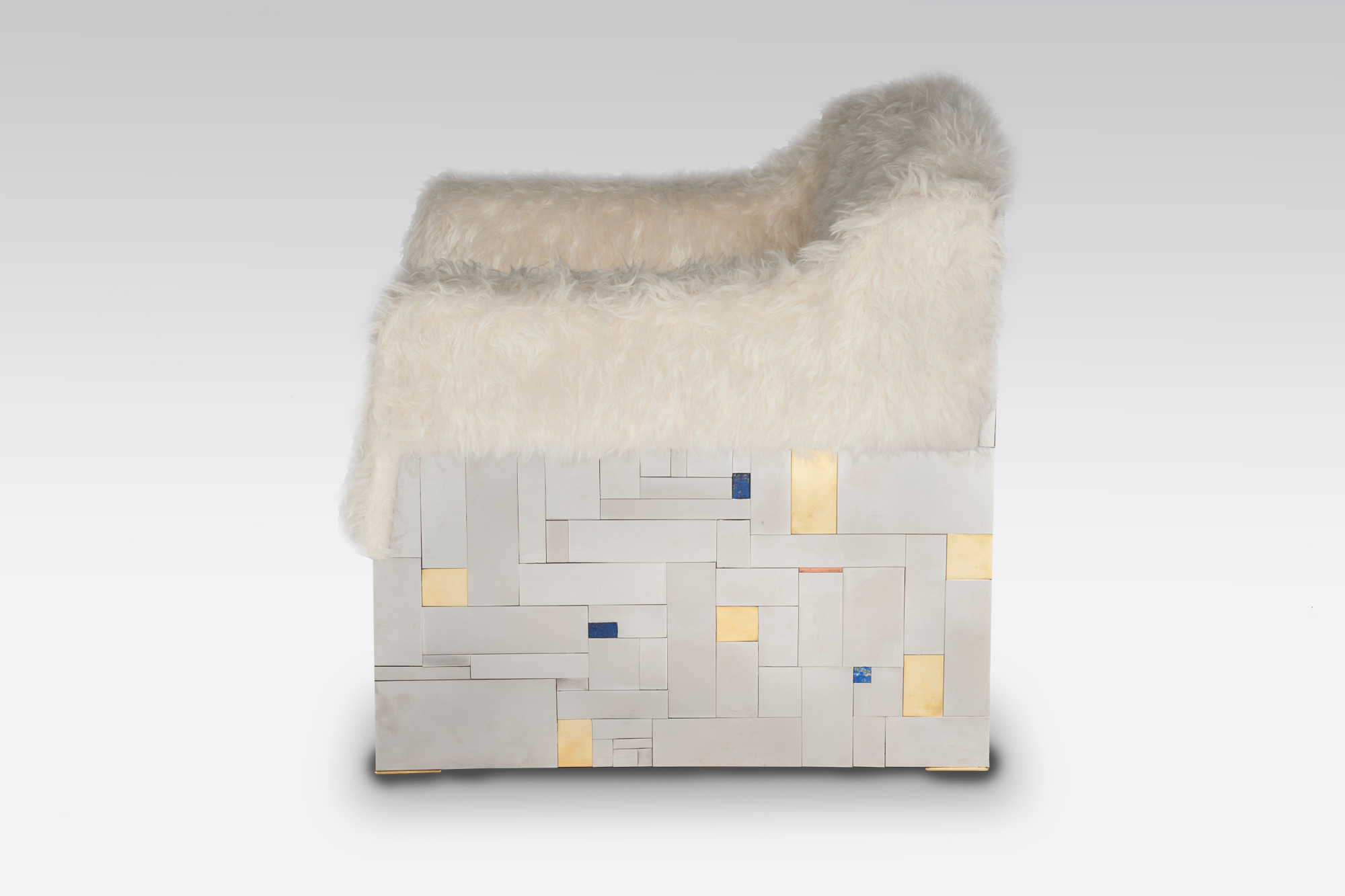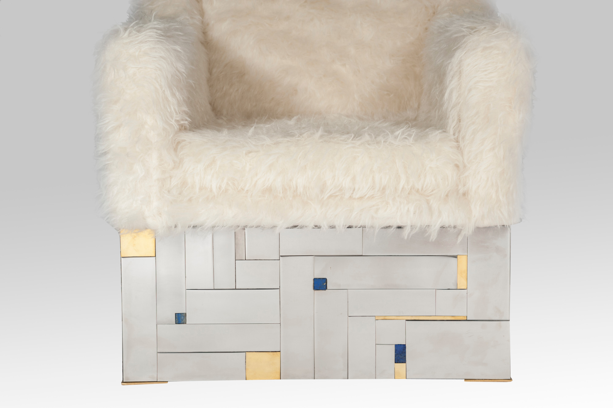 Created to measure by Stan Usel, this original pair of easy armchairs in stainless steel, red copper and brass are inserted with original lapis lazuli stones and covered with comfortable genuine teddy bear wool. Exceptional craftsmanship with the art of tailor made furniture. This original and unique piece is signed by the artist and comes with a certificat of authenticity.All pieces can be custom-made to order. Proudly Belgian.