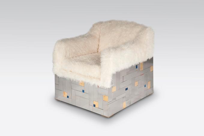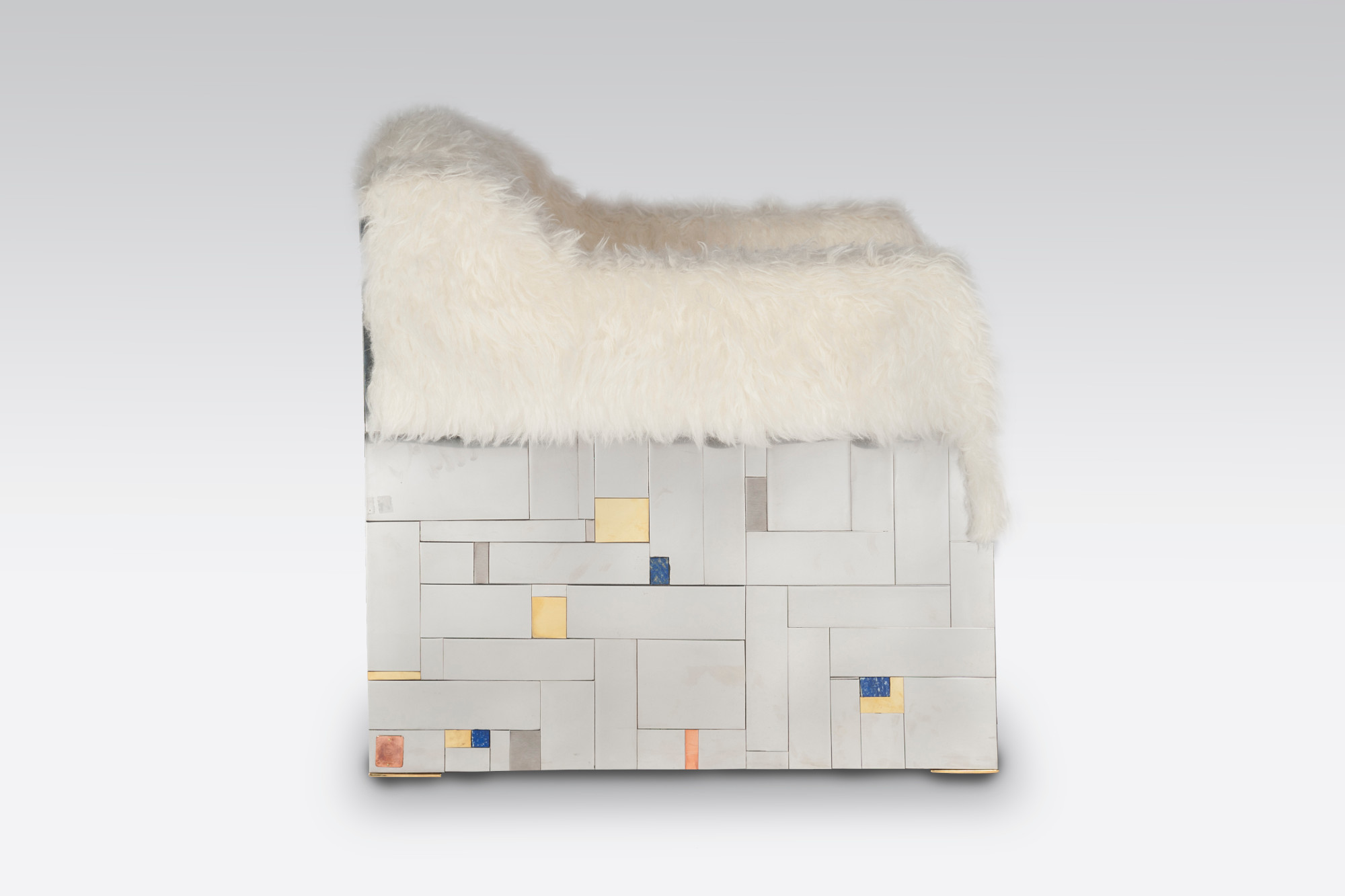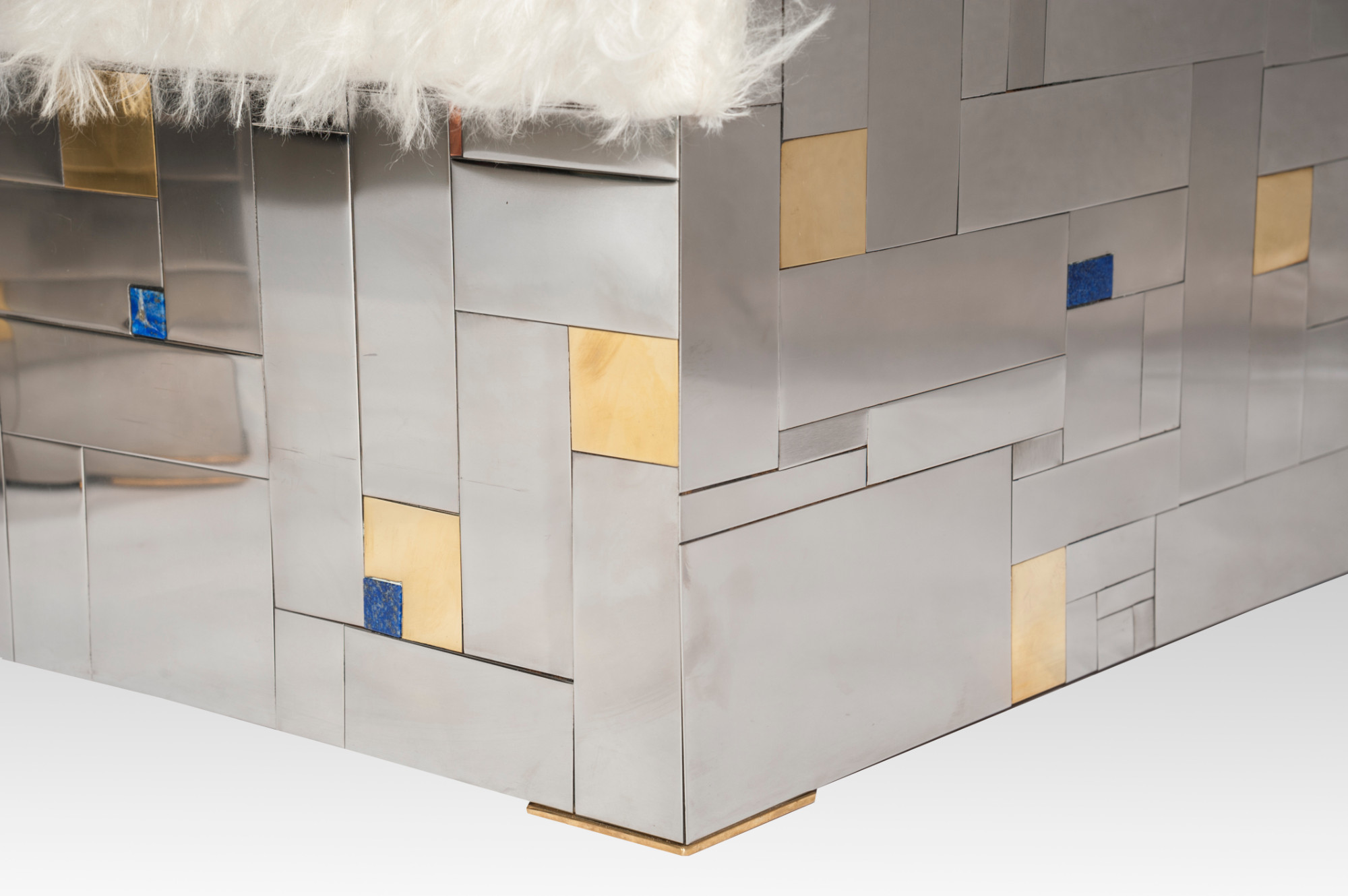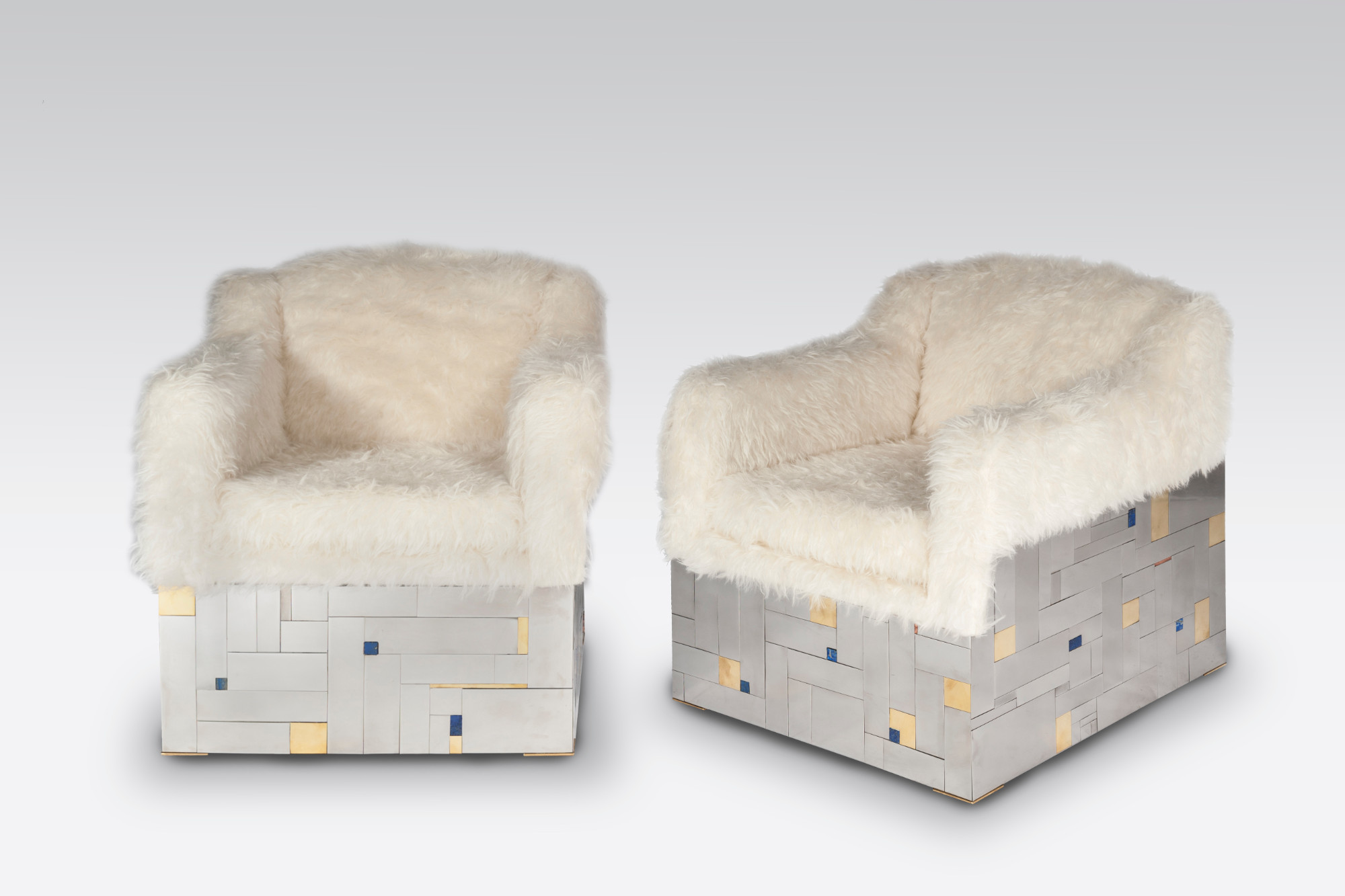 Created to measure by Stan Usel, this original pair of easy armchairs in stainless steel, red copper and brass are inserted with original lapis lazuli stones and covered with comfortable genuine teddy bear wool. Exceptional craftsmanship with the art of tailor made furniture. This original and unique piece is signed by the artist and comes with a certificat of authenticity.All pieces can be custom-made to order. Proudly Belgian.